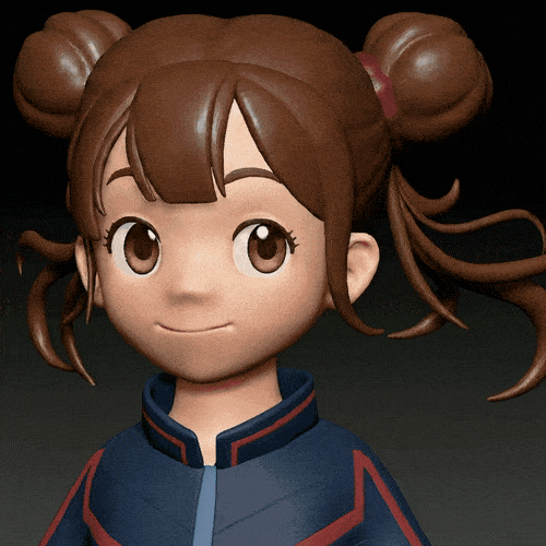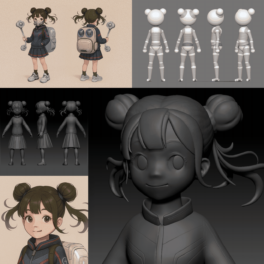 Using ZBrush to block out and sculpt this character based on manga illustration references, starting with rough shapes to establish the overall silhouette and proportions. Once our final character model is complete, we gave it color and animation using AI.